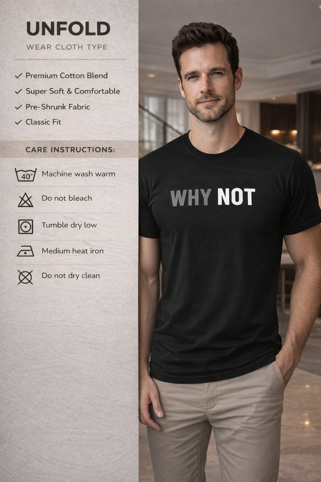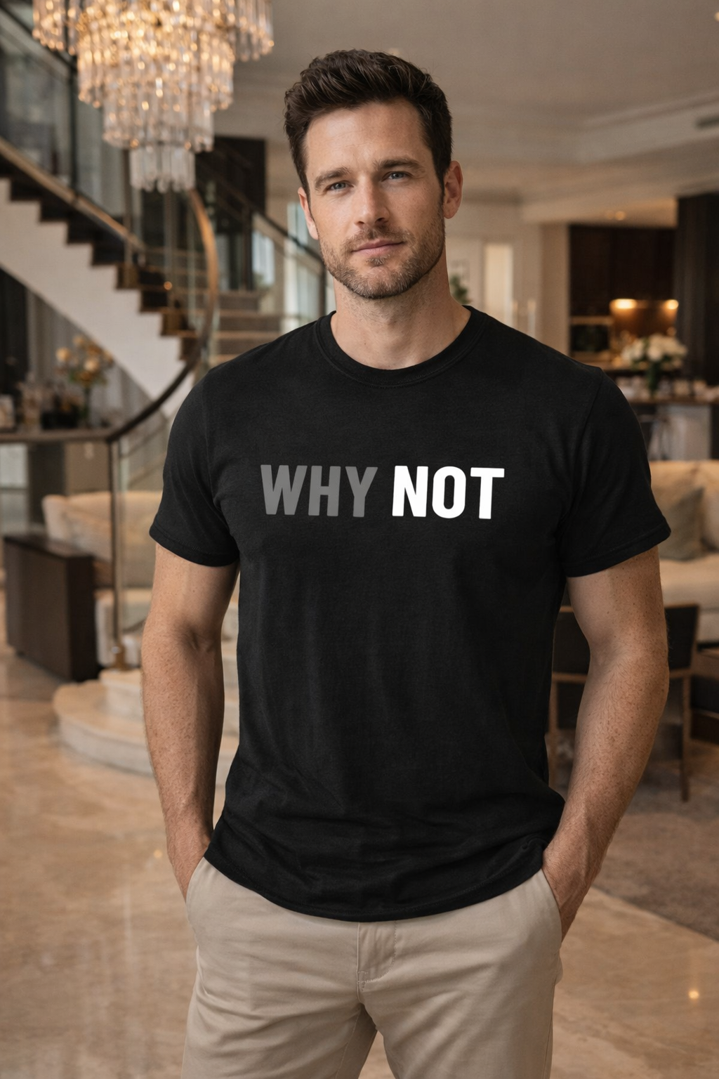 A sleek black t-shirt featuring a bold “WHY NOT” print that speaks confidence and simplicity. Designed for everyday wear, this minimalist piece adds a modern, motivational edge to your style while keeping comfort and versatility at its core.